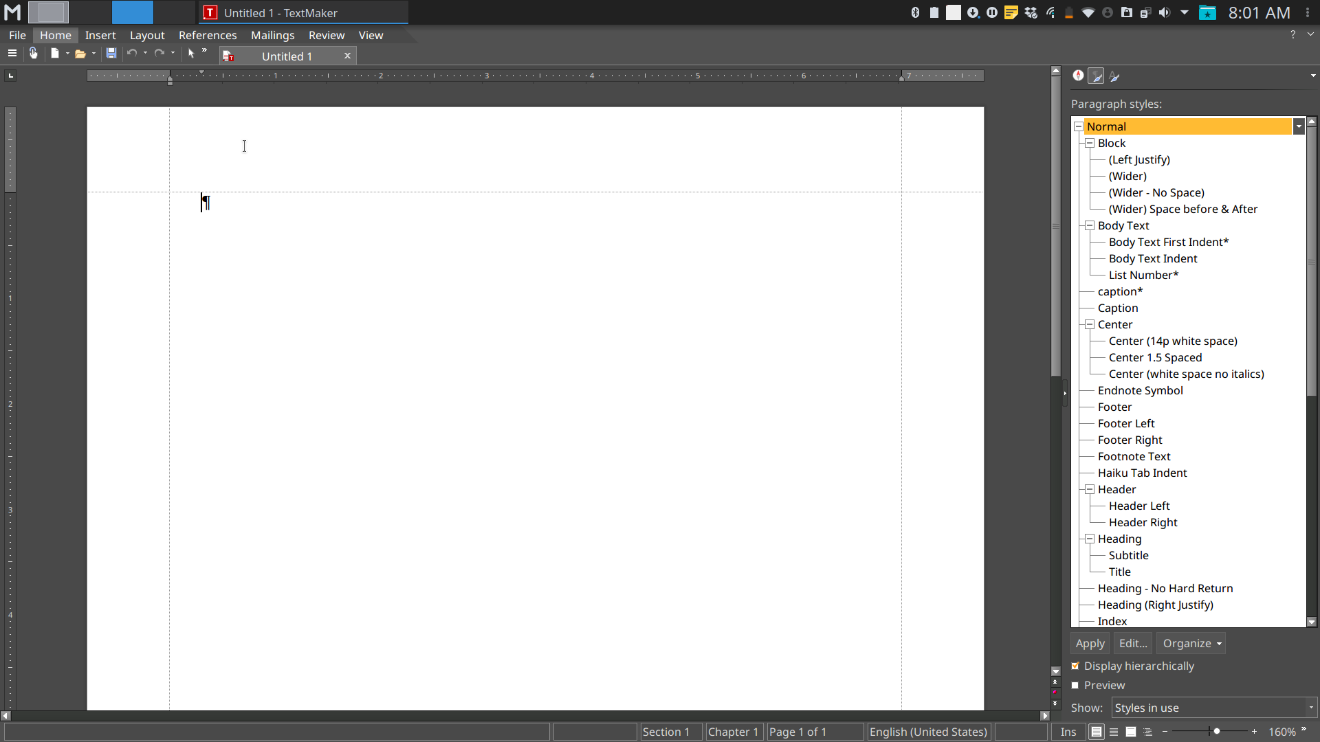 I will report the issue that it is not possible to scroll through the styles using the mouse's scroll button in TextMaker 2018 for Linux.vtpoet wrote: Tue May 29, 2018 2:52 pm The ability to hide the styles "not in use" means I wouldn't have to search through all my paragraph styles every time I needed to apply formatting. This issue is compounded by the fact that in Linux (unlike Textmaker in windows), I can't scroll through the styles using the mouse's scroll button.