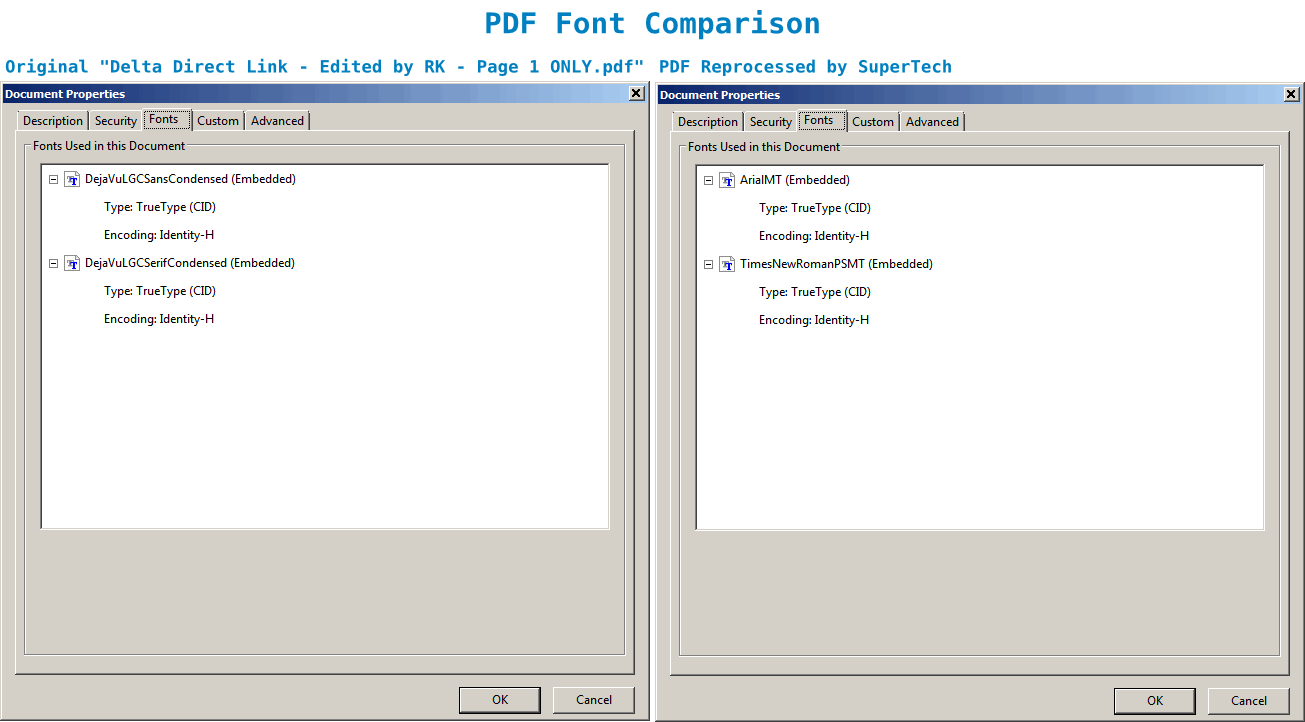 This is a PNG image showing the differences between the PDF fonts used in the PDF I generated and the one generated by SuperTech.