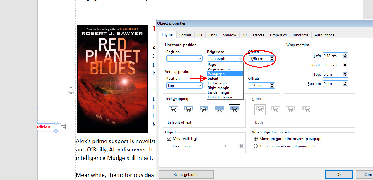 "The position of both text boxes says 3,56 cm left of the column, and the question is now where the column starts. As the document is a single column, TM assumes the left page margin. Word thinks it's the position where the text starts after it has moved because the image blocks the regular place.