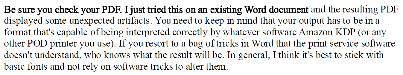 This was news to me so, of course, I had to try it. I created a sample paragraph in Word, used the Text Effects feature to add an outline with a line thickness of 0.25 points, and then converted to PDF using three different methods: