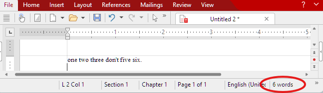 But while "don't" is a contraction for two words, "can't" is a contraction of one word: "cannot." If I change "can't" to "cannot" in the sample sentence, TextMaker then correctly reports six words -- even though "cannot" is longer than "can't."