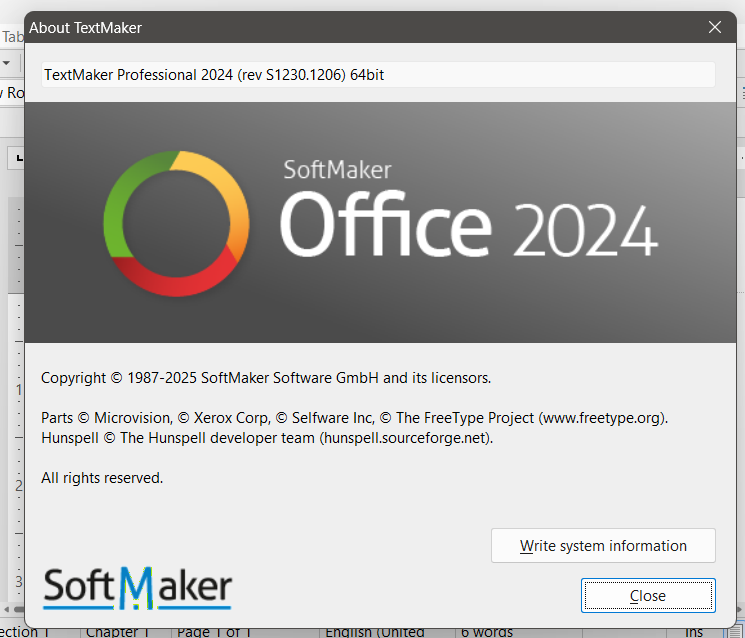Here's "don't" counting as 2 words, "One two three four (five)." (please note the period at the end) counting as six words, and my version number of TextMaker (Professional 2024 (rev S1230.1206) 64bit).