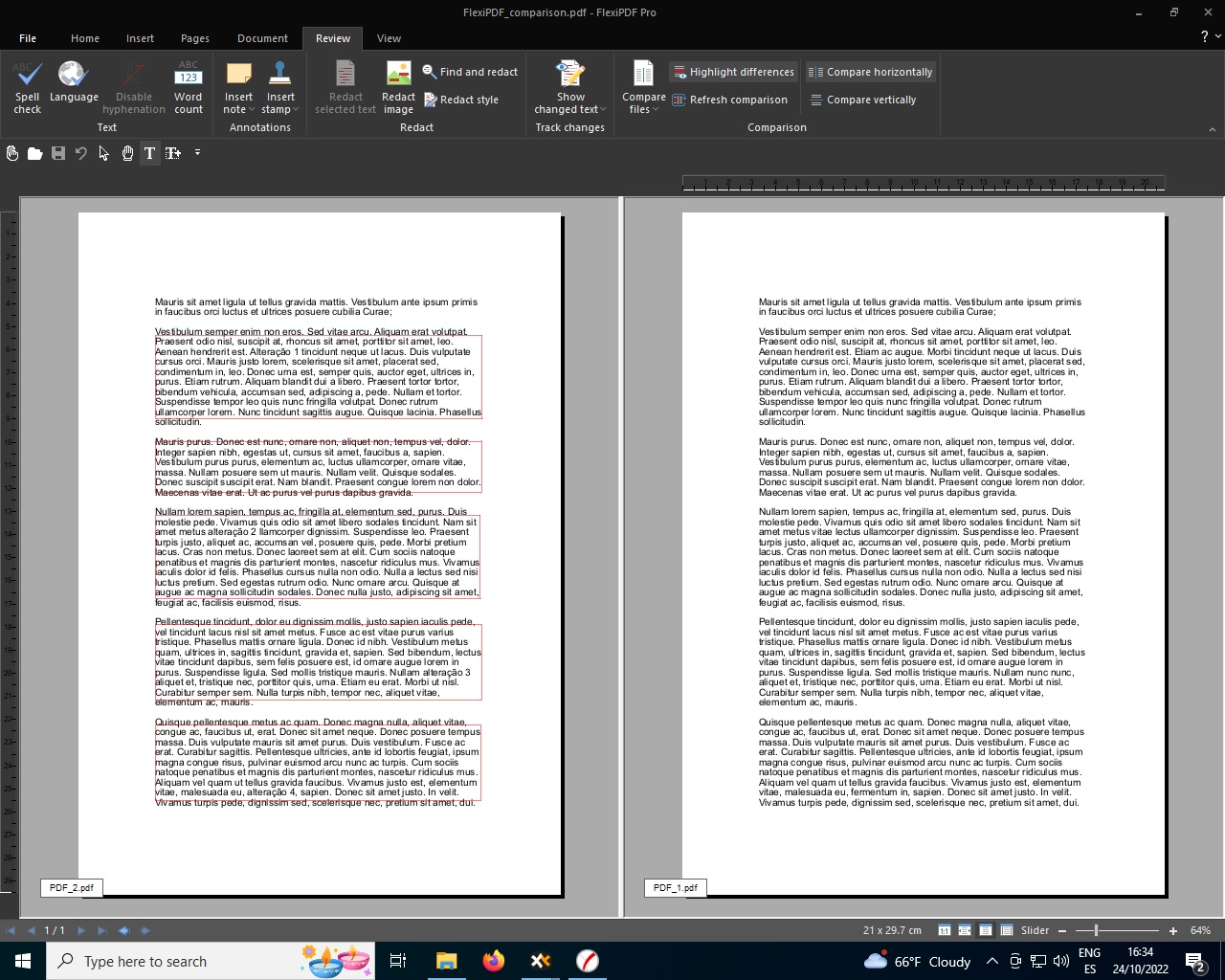 I am sending you the comparison results in Acrobat (an old version) and FlexiPDF (differences highlighted) of two brief PDF files. The difference is obvious.