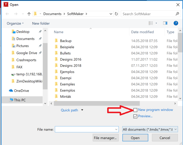 By default, TextMaker opens multiple documents in tabs in the same window. If you need two documents side by side, check the checkbox "New Program window" in the File > Open... dialogue box when opening the second document, then resize and arrange the two windows. When two or more documents are already open in tabs, you may also reduce the window size (if in full size or full screen mode), then draw a tab to the desktop with the mouse to create a second window.