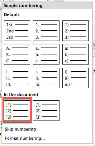 I made a mistake customizing a "Bullet and simple numbering" list. I wanted to format a list where the number is surrounded with square brackets but mistakenly used the wrong leading bracket. I wanted "[1]" but typed the wrong leading bracket "]1]".