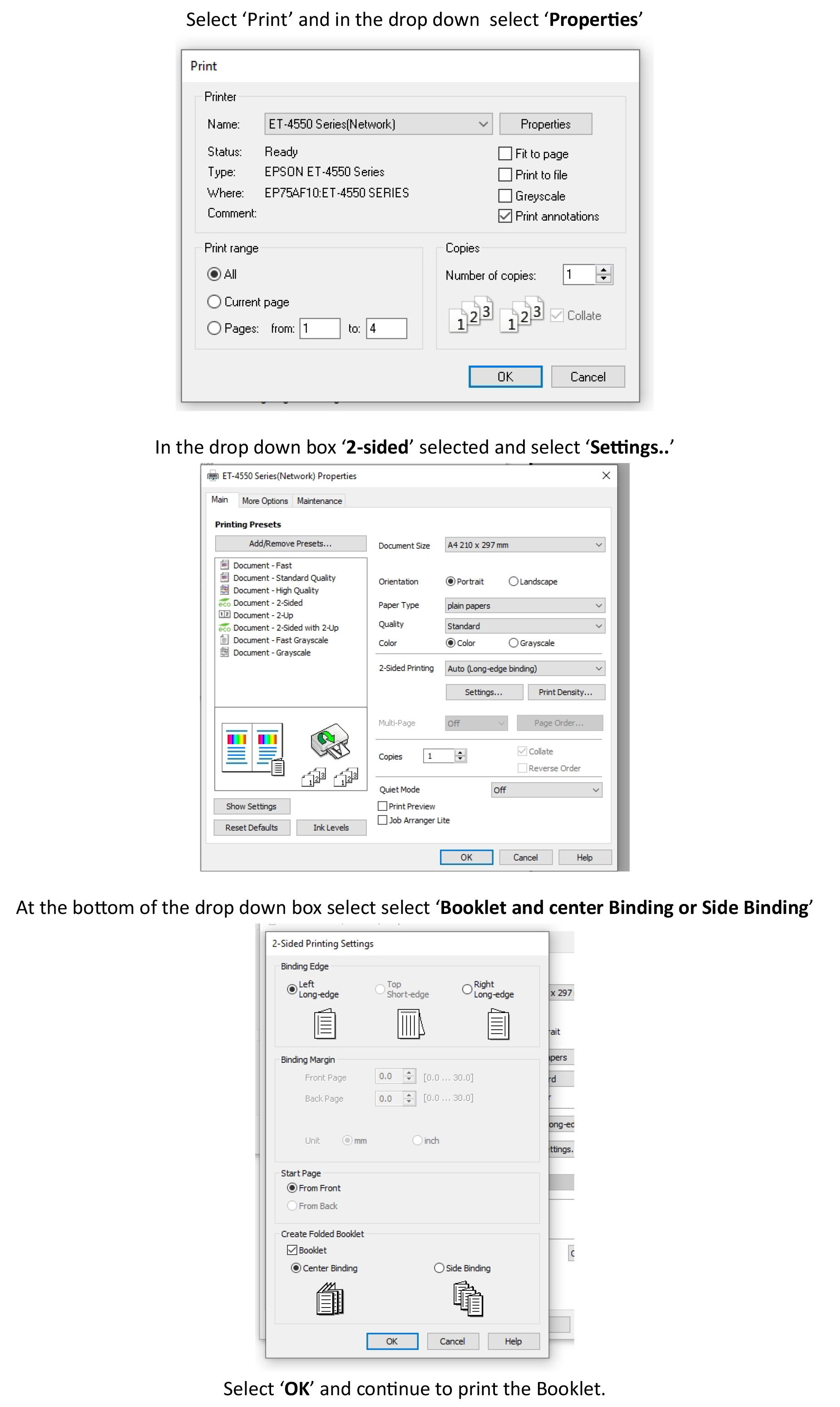 Found that there is no Booklet Printing option within the program but my Epson printer (ET4550) software provides it.