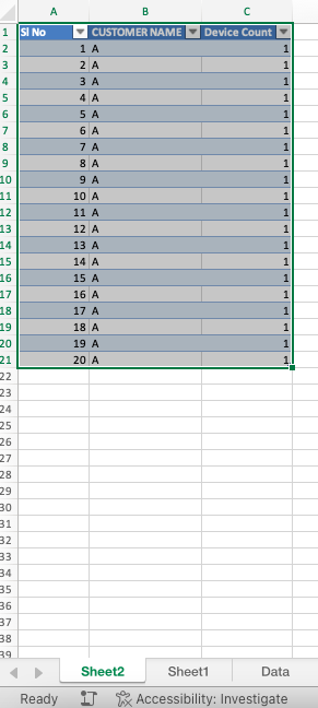 In MS excel if i click on result of sum of device count, for example on 20 or 16 it opens result in another tab/sheet like as follows