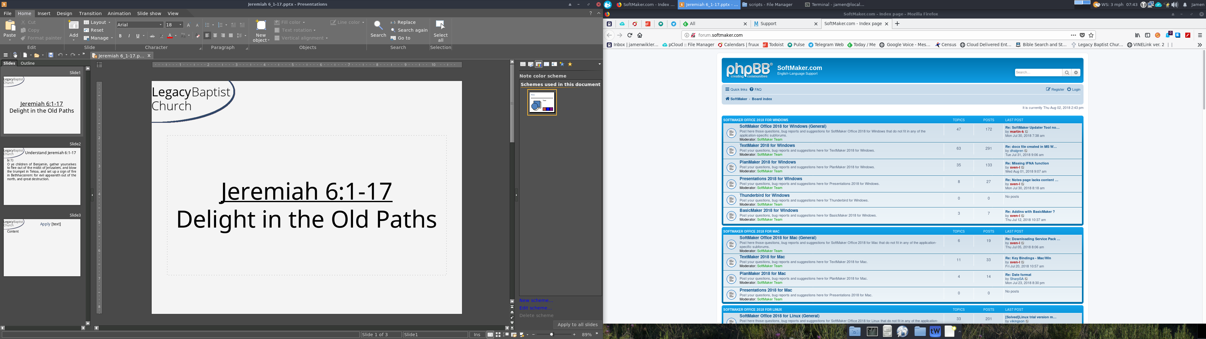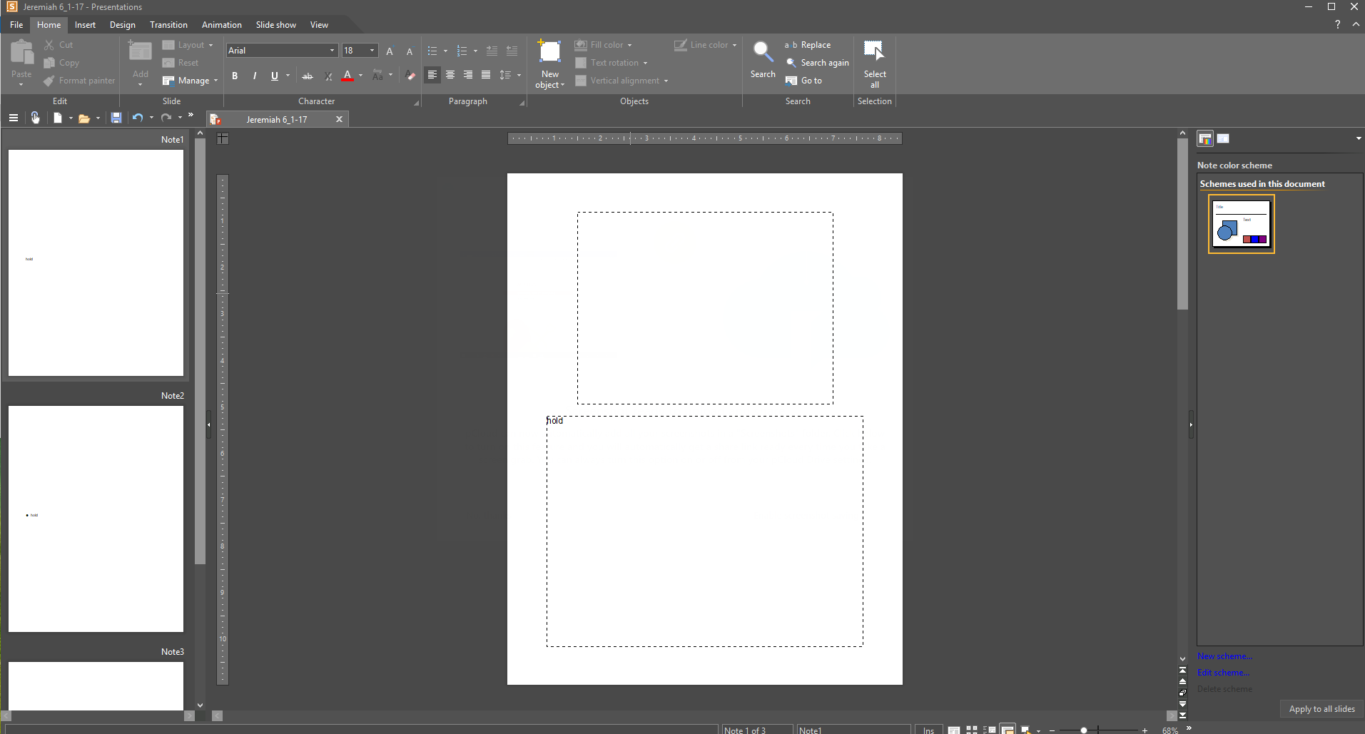 This is the content of my slides: And this is the content of my notes pages: I am, by the way, reproducing this error in Linux at the moment, revision 933, so the problem is in both Linux and Windows versions. I might wonder, once again, if it has something to do with my multi-monitor setup? And it isn't just about displaying wrong. If I attempt to export my notes pages to PDF, the slides appear as blank. That file is attached as well for proof.