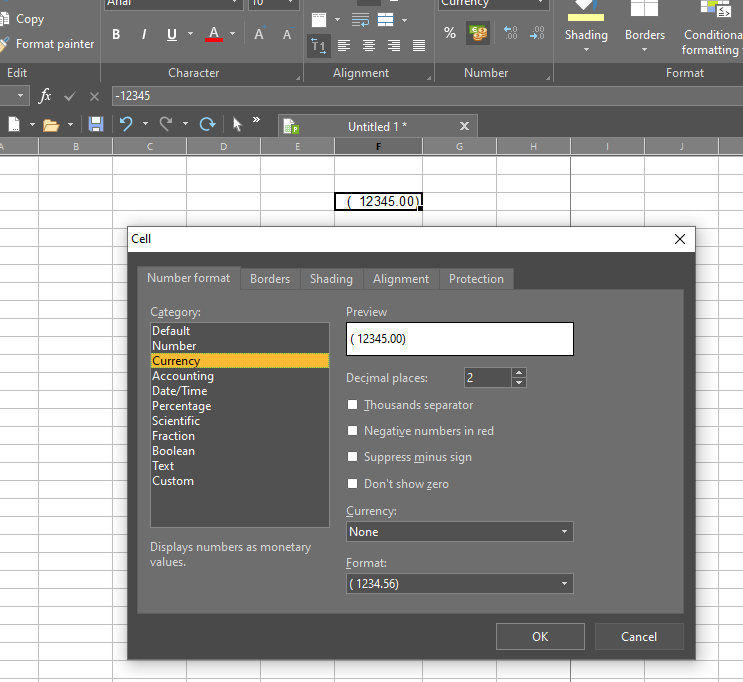 I have tried to have a negative value displayed in PlanMaker in brackets instead of using a negative symbol followed by the value, but to no avail. Tried the "custom" method (which is available under Number format --> Default --> More --> Custom), but still couldn't get it to be displayed in brackets. Excel forum mentioned changing the command in the custom field, which I did and it worked, but I can't maintain the change as a default function or standard feature. Have to try to do this everytime, which is troubling and inconvenient. Plus different spreadsheets require this to be set up everytime.