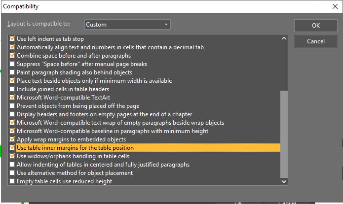 3. Scroll down, and you will find 5th setting from the end is "Use table inner margins for the table position" checked.