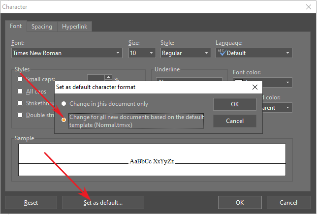 I have followed the instructions for character changes and 'set as default' for all new documents. When I close TextMaker and reopen it, I get Times New Roman 10 again, rather than the Calibri 12 which I have set.