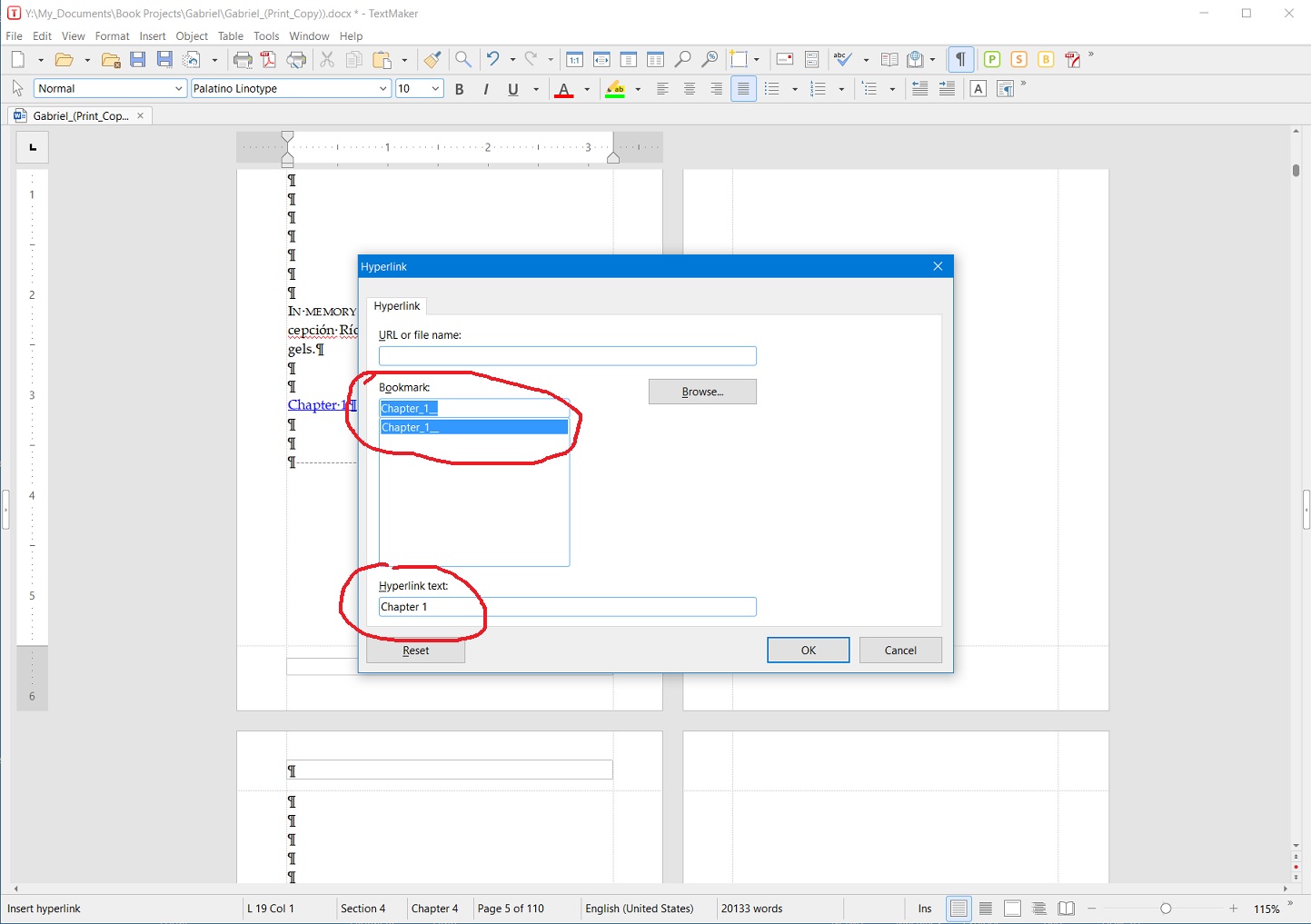 But then when I go back to the hyperlink and try it again, nothing happens. I examine the hyperlink (by Edit hyperlink) and find that the hyperlink lists a file like "filename#bookmark" with nothing in the bookmark field, so naturally they hyperlink doesn't work the 2nd time. It's a mystery, but hopefully one of the Softmaker techs will see this post and have an idea.